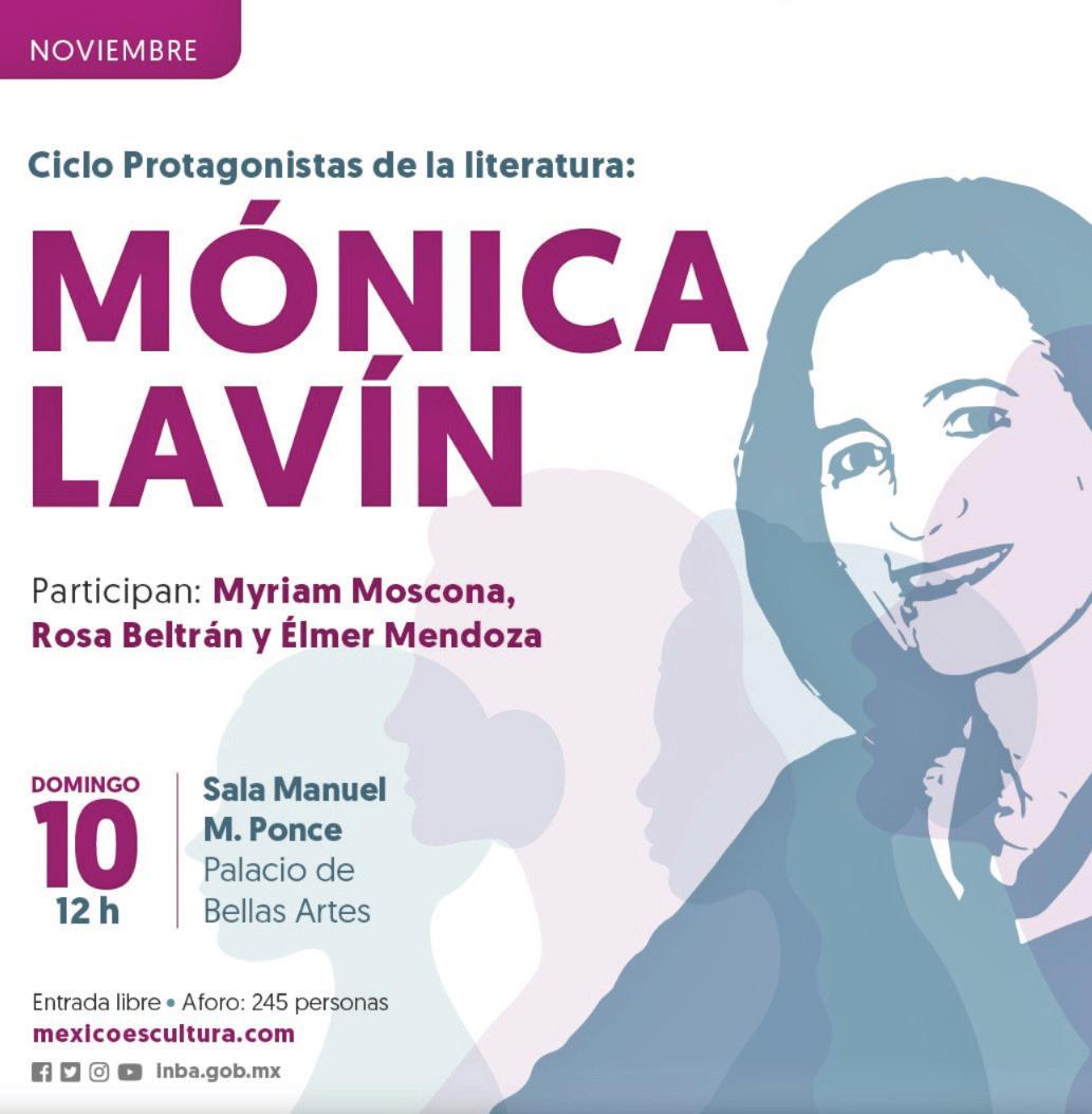 En el marco del ciclo Protagonistas de la Literatura, la Secretaría de Cultura federal y el Instituto Nacional de Bellas Artes y Literatura (INBAL), a través de la Coordinación Nacional de Literatura (CNL), abordarán la obra de la escritora y periodista mexicana Mónica Lavín, ganadora del Premio Nacional Letras de Sinaloa 2023. El evento se realizará el domingo 10 de noviembre a las 12:00 h en la Sala Manuel M. Ponce del Palacio de Bellas Artes.