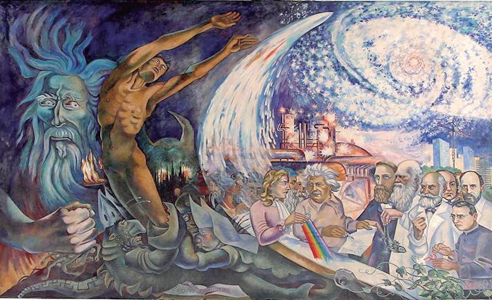 Hace unos meses, al buscar información sobre Oswaldo Barra para alimentar esta columna, me encontré con esta imagen del mural Claridad científica frente a los dogmas y fanatismos, que también es conocido con el título de El oscurantismo frente a la claridad de la ciencia, pintado por Barra para el científico Mauricio Russek Berman, y cuya familia donó la obra a la Academia Mexicana de Ciencias (AMC), de cuya página en Internet tomé esta imagen.