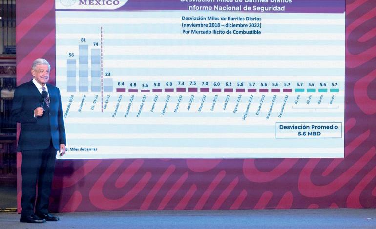 El presidente Andrés Manuel López Obra dor destacó la contribución de las Fuerzas Armadas en la estrategia contra el robo de combustibles, lo que representa ahorros para el país. “Tenemos el apoyo constante de las secretarías de Marina, de Defensa; están los datos sobre las tomas clandes tinas y que se atienden constantemente, sobre todo, los resultados”, subrayó en conferencia de prensa matutina.