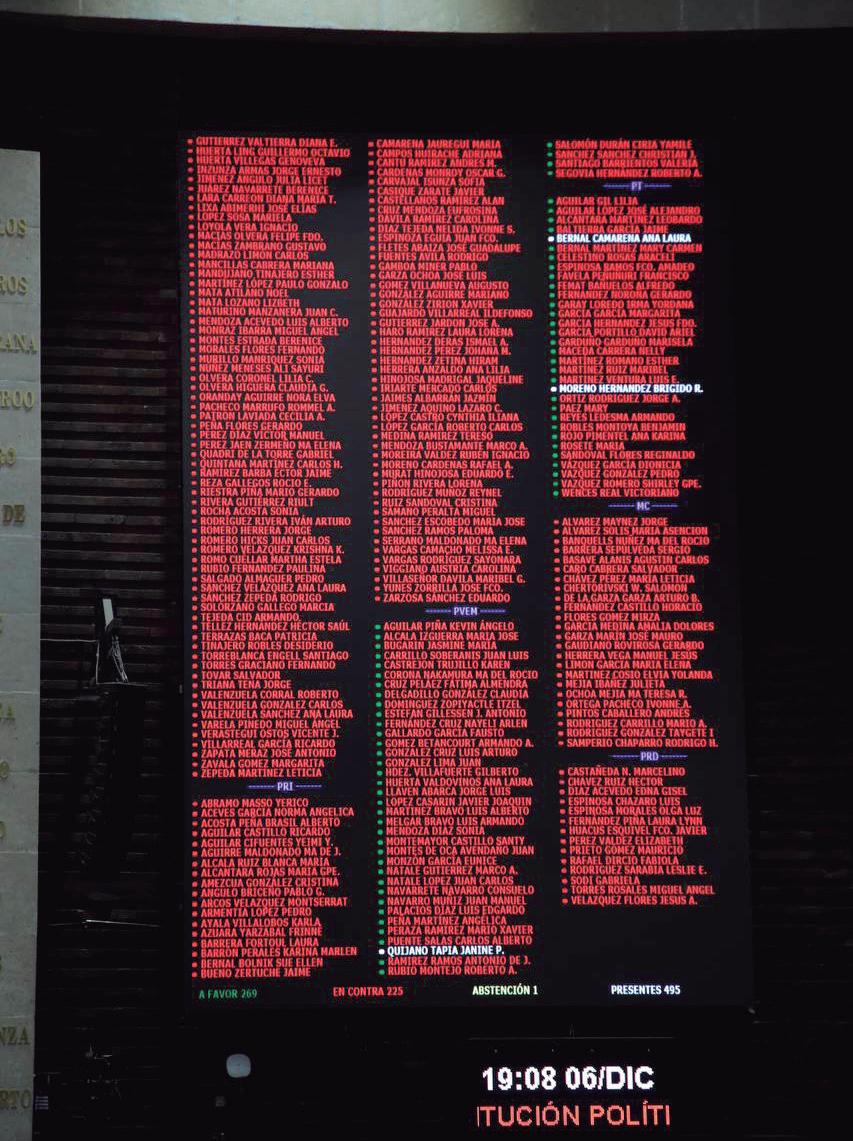 La Cámara de Diputados rechazó la reforma electoral consti tucional impulsada por el presidente Andrés Manuel López Obrador, con 269 votos a favor, 225 en contra y una absten ción, el dictamen no alcanzó la mayoría calificada necesaria para su aprobación en lo general. La no discutida reforma del presidente planteaba, principalmente, la extinción de los organismos públicos locales y los tribunales electorales de los estados, la conformación del Instituto Nacional de Elecciones y Consultas y de la Sala Superior del Tribunal Electoral del Poder Judicial de la Federación, la elección de legisladores mediante sistema de listas por entidad federativa, así como reducción de integrantes de congresos locales, ayuntamientos y alcaldías.