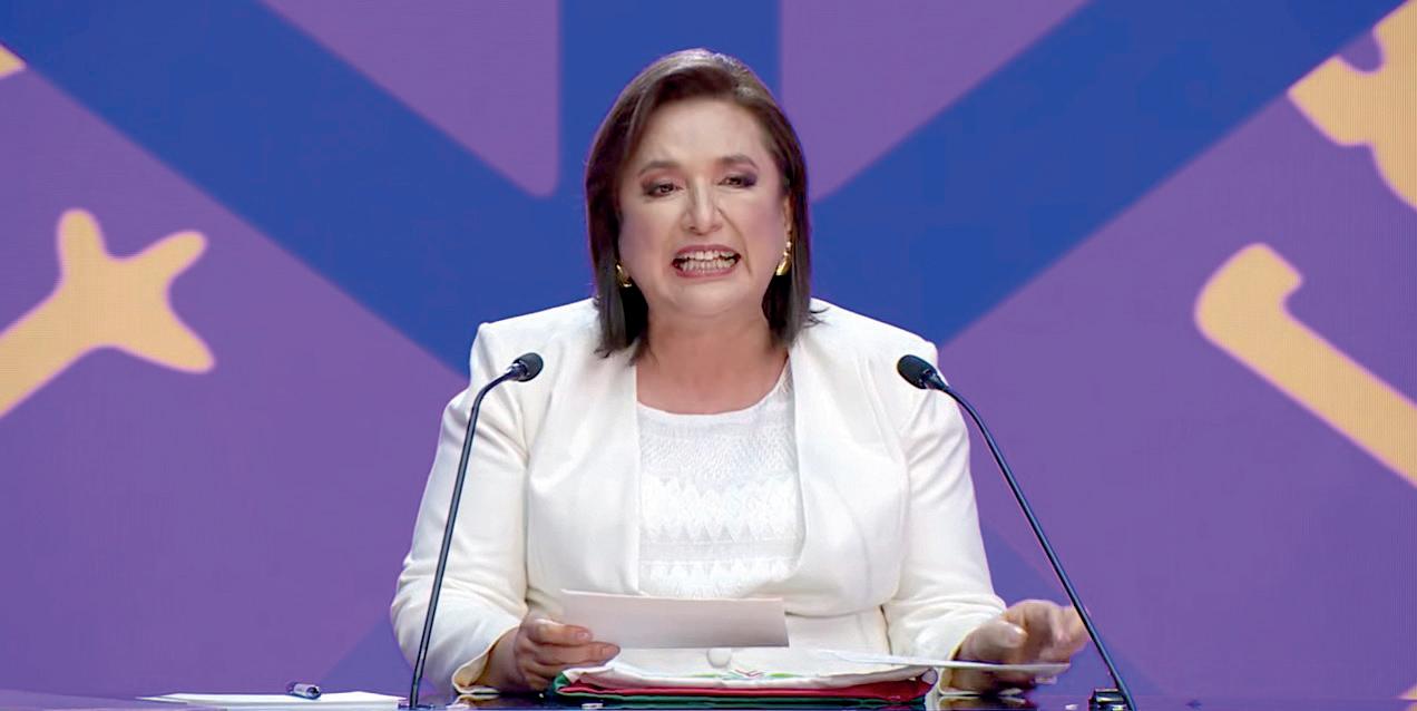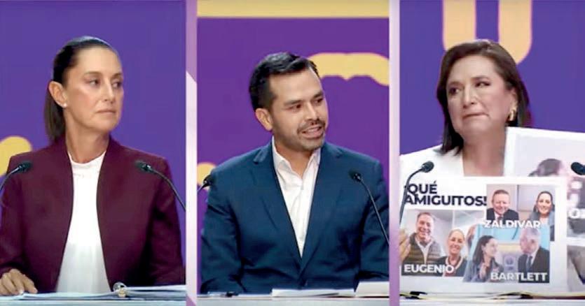 rez Máynez, las criticaba de representar a la “vieja política” y de estar rodeadas de personajes con polémicos pasados. No obstante, se enfocó más en atacar a la exsenadora al criticar a sus “amigos” Alejandro Moreno, Francisco Cienfuegos y Manlio Fabio Beltrones: “ella ahora, aunque le pese, es la candidata del peor PRI de la historia”. Un elemento que llamó la atención de la candidata de la 4T fue el reclamo que, junto con el emecista, hicieron de las fallas en el reloj digital y que, aparentemente beneficiaba a la exsenadora. Fue cuando Sheinbaum la acusó: “Hasta la bolsa del tiempo la candidata del PRIAN se las quiere robar”. Eso puso en breves aprietos a la moderadora Denise Maerker, igual que lo que pareció un regaño de la exjefa delegacional de Tlalpan, cuando los candidatos interrumpían: “¿Vamos a hablar de otros temas?... Pues yo quiero hablar de esto”, y seguía su propio guión, ignorando las preguntas de los conductores. Así lo hizo desde el principio, cuando felicitó al cuerpo diplomático de Ecuador “por su valentía”.