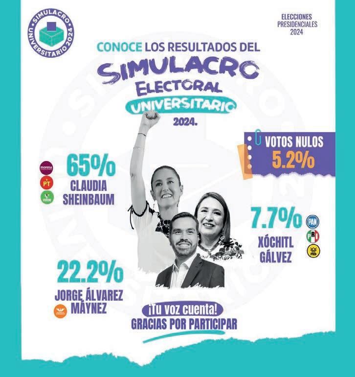 Se realizó el Simulacro Electoral Universitario en cerca de 400 universidades del país, estudiantes, profesores y trabajadores de instituciones públicas, entre las que se encuentran la UNAM, el IPN, UAM, la UPN, la UdeG, la BUAP, la UANL, entre otras, practicaron su voto para elegir la Presidencia de la República, los resultados preliminares fueron los siguientes: Claudia Sheinbaum Pardo, 65%; Jorge Álvarez Máynez , 22.2% y, en tercer lugar, con 7.7% Xóchitl Gálvez Ruiz