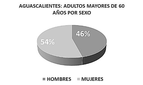 Entre hombres y mujeres es mayor la esperanza de vida femenina hasta por cinco años, de donde se desprende que el 54% de los adultos mayores lo conforman ellas contra el 46% de ellos. Las proyecciones de población del CONAPO nos permiten ver que el proceso de envejecimiento aguascalentense se empatará con el nacional en las próximas décadas; para entonces Aguascalientes perderá cerca de 100 mil infantes y ganará 300 mil adultos mayores de 60 años.