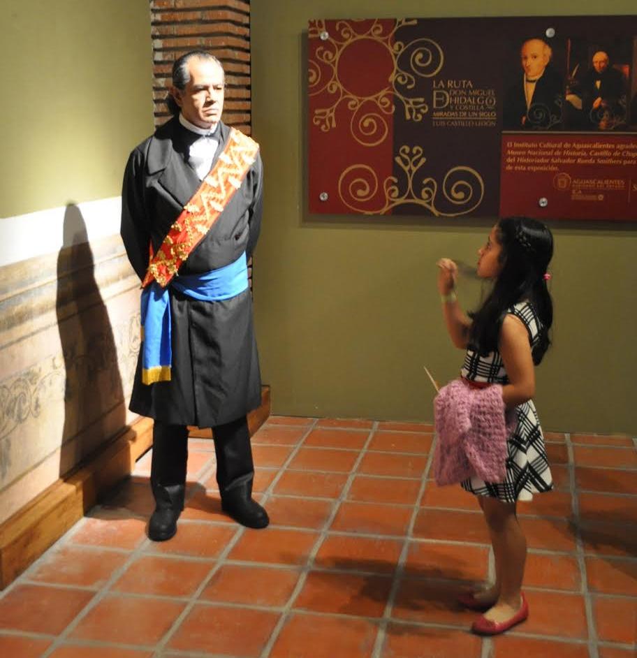 La imagen corresponde a una representación del episodio ocurrido en la hacienda de San Blas de Pabellón, hoy Pabellón de Hidalgo; una de las, por lo menos, tres que se han llevado a cabo en el antiguo Museo de la Insurgencia… El personaje del Padre de la Patria es encarnado por el primer actor Fernando López. Tomé esta fotografía hace 10 años, el 12 de septiembre de 2015, una imagen que me conmueve, la grave solemnidad de Fernando Hidalgo, el Padre de la Patria iluminado de manera particular, el hombre de mirada fija en… ¿Qué ve el sacerdote defenestrado? ¿El pasado, ese fuego que todo lo incendia e ilumina, que él creó, le quemó las manos y terminó soltándolo, o el futuro, el paredón de fusilamiento que ya lo espera en Chihuahua para su encuentro final, 6 meses después? ¿Qué Observa? ¿Y qué decir de la niña que lo contempla, espejo de la pureza que muchos añoramos y que ella derrocha? ¿Qué es lo que pasa por su mente infantil entre tanto? ¿La Historia gloriosa de México, pletórica de violencia, sangre y heroísmo? ¿Las luces y sombras de 200 años, el clamor de los que fueron y los que son? ¿Querría la infanta algo de la luz que irradia el padre Miguel López?