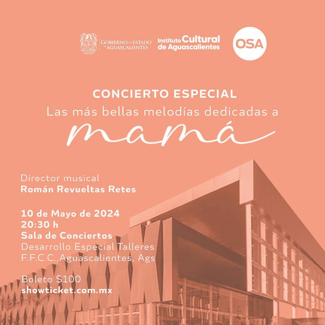 Asiste este 10 de mayo al concierto del Día de la Madre y disfruta de las más bellas melodías dedicadas a mamá interpretadas por la Orquesta Sinfónica de Aguascalientes, bajo la dirección del maestro Román Revueltas Retes. La cita es el viernes a las 20:30 horas en la Sala de Conciertos (Desarrollo Especial Talleres F.F.C.C.). El costo del boleto es de $100.00 a la venta a través de www.showticket.com.mx o en taquillas de la Sala de Conciertos el día del evento a partir de las 18:00 h. Para estudiantes con credencial vigente o adultos mayores con credencial de INAPAM la entrada es libre. | ICA