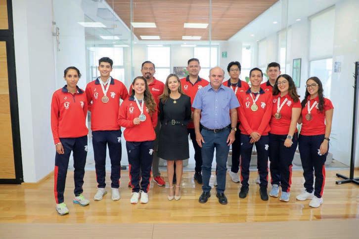 Con el propósito de reconocer su dedicación en el ámbito deportivo y felicitarlos por su esfuerzo, la rectora de la Universidad Autónoma de Aguascalientes, Sandra Yesenia Pinzón Castro, se reunió con los alumnos ganadores de medalla de la Universiada Nacional 2024, la cual, por primera vez tuvo lugar en Aguascalientes.
