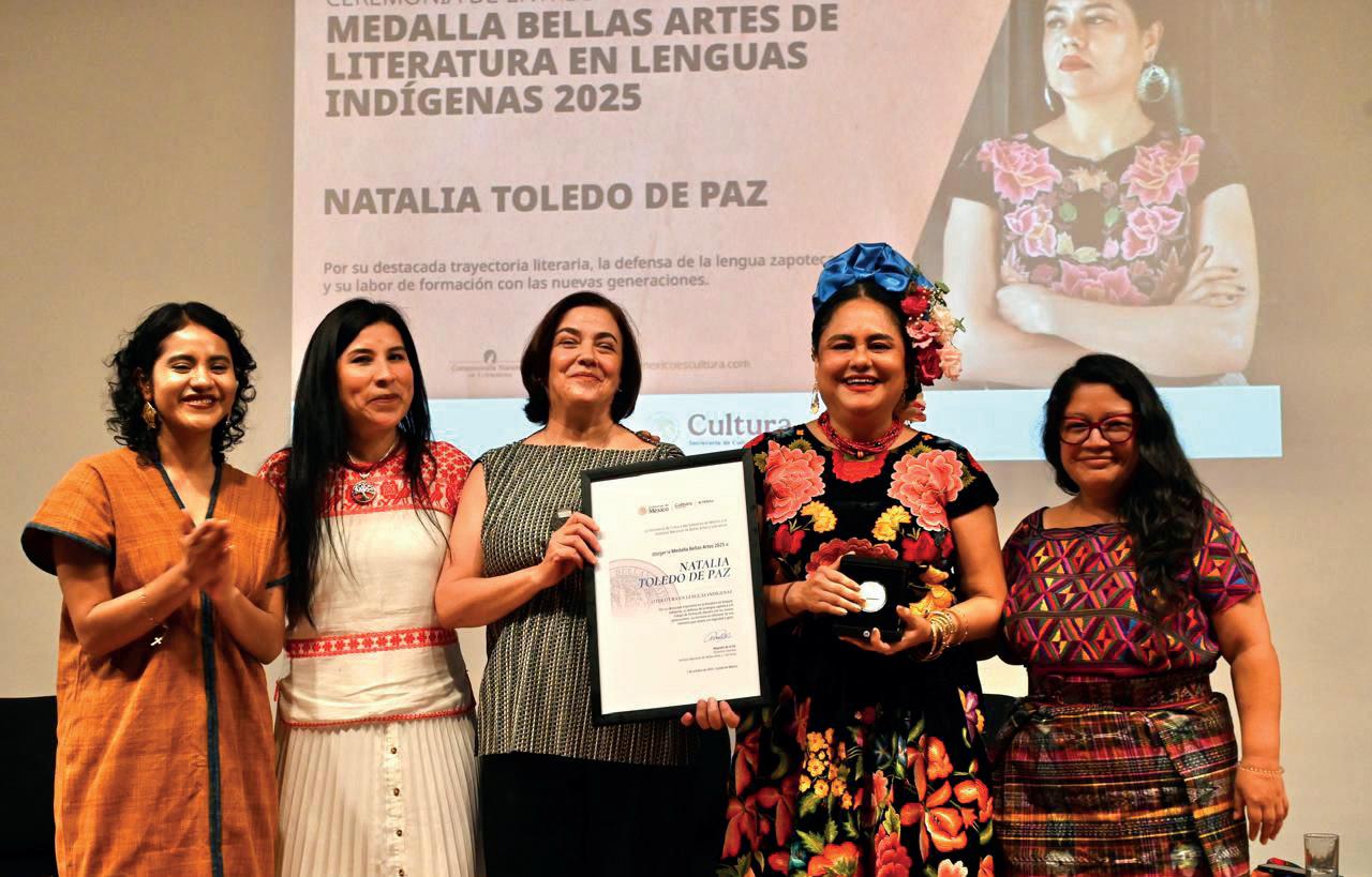 La Secretaría de Cultura del Gobierno de México y el Instituto Nacional de Bellas Artes y Literatura (INBAL), a través de la Coordinación Nacional de Literatura, entregaron el martes 7 de octubre, la Medalla Bellas Artes en la disciplina de Literatura en Lenguas Indígenas 2025 a la poeta Natalia Toledo de Paz, como reconocimiento a su destacada aportación al arte y la cultura de México.