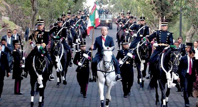 A su llegada al Zócalo de la Ciudad de México, ante elementos de las Fuerzas Armadas y algunos menores estudiantes de escuelas públicas, el Ejecutivo federal pasó la lista de honor a los héroes del Heroico Colegio Militar.