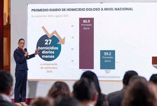 “De septiembre 2024, -nosotros recuerden entramos el primero de octubre-, septiembre del 2024 que tuvo 86.9 homicidios diarios en promedio, agosto tiene 59.2, lo que representa 27 homicidios diarios menos. En agosto 27 personas menos perdieron la vida por homicidio doloso respecto a septiembre de 2024. Una felicitación al Gabinete de seguridad y el trabajo diario de todas y de todos. Muy importante esta reducción”, puntualizó.