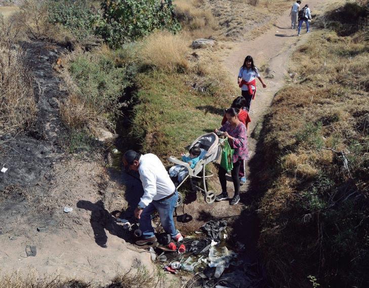 con pequeños que tienen que alzar en brazos para librar el salto, algunos adultos mayores optan por un camino alterno más angosto y con arbustos espinosos; desde el otro lado, una pareja baja la pendiente aún más inclinada e irregular llena de tierra suelta cargando la carriola donde llevan a un niño pequeño, al llegar al paso del valle, el hombre pisa en falso y hunde su pie izquierdo en aquel fango contaminado hasta arriba del tobillo, sin más que un ligera risa de resignación, continuó caminando mientras su pareja logró con trabajo cruzar. En cerca de 900 metros del arroyo sobre la avenida 30 de septiembre no hay infraestructura que conecte a los fraccionamientos y permita llegar al peatón de forma rápida y segura, no hay otra forma más que los caminos que se hacen al andar.