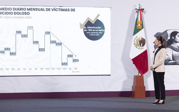 El Gobierno de México continúa mostrando avances en su lucha contra la violencia y el crimen organizado, respaldado por la Estrategia Nacional de Seguridad. La presidenta Claudia Sheinbaum, durante su última comparecencia, destacó que, entre septiembre de 2024 y febrero de 2025, se logró una disminución del 15 por ciento en el promedio diario mensual de víctimas de homicidio doloso. En un esfuerzo por enfrentar la crisis de violencia en el país, la presidenta subrayó que esta reducción es uno de los logros más significativos hasta la fecha, resultado directo de las acciones de seguridad, las detenciones de delincuentes y el trabajo coordinado con los Estados Unidos. Durante la rueda de prensa, Sheinbaum mencionó el aseguramiento de más de 266 mil pastillas de fentanilo en Sinaloa, como parte del Operativo Frontera Norte, estrategia clave para controlar el tráfico de sustancias ilícitas, especialmente aquellas como el fentanilo, que han crecido en importancia en el combate al narcotráfico.