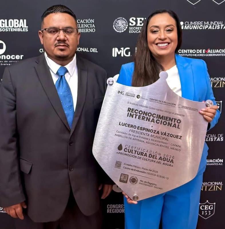 El municipio de Pabellón de Arteaga fue distinguido con el Reconocimiento Internacional Certificación 2026 Cultura del Agua, un galardón que reconoce las acciones emprendidas para fomentar el uso responsable del recurso hídrico y fortalecer la conciencia ciudadana sobre su cuidado.