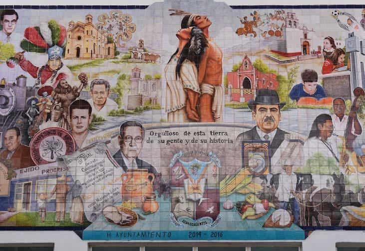 El mural, hecho en cerámica, se debe al artista plástico Guillermo Cuellar Arellano y el ceramista Arturo Muñoz M. La instalación estuvo a cargo de Alejandro Carrillo E., y fue instalado en la presidencia municipal en 2015, con motivo del 50 aniversario de la creación del municipio. (Felicitaciones, ampliaciones para esta columna, sugerencias y hasta quejas, diríjalas a carlos.cronista.aguascalientes@ gmail.com).