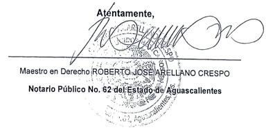 ocurrida en el municipio de Pabellón de Arteaga, el día trece de mayo del dos mil veinticuatro. Il.-A presentar el primer testimonio del Testamento Público Abierto otorgado por la señora NOEMI ESPINOZA RODRIGUEZ, del día cinco de marzo de dos mil veintiuno, bajo la escritura pública número tres mil quinientos treinta y uno, otorgada ante el suscrito Maestro en Derecho Roberto José Arellano Crespo, Notario Público Sesenta y Dos en ejercicio del Estado de Aguascalientes, III- Los señores ROSANA GONZÁLEZ ESPINOZA Y ANTHONY FERNANDO CALZADA GONZALEZ reconocen sus derechos hereditarios y aceptan la Herencia tal y como lo dispuso el De Cujus en su testamento. IV.- Finalmente la señora ROSANA GONZÁLEZ ESPINOZA, en este acto acepta el cargo de albacea y protesta su fiel y legal desempeño y solicita se haga la publicación que ordena la Ley, en el Periódico Oficial del Estado y en un Diario de Circulación Estatal. Lo anterior se publica para dar cumplimiento al Artículo 775 del Código de Procedimientos Civiles en el Estado de Aguascalientes. Aguascalientes, Aguascalientes, a 09 de julio de 2024.