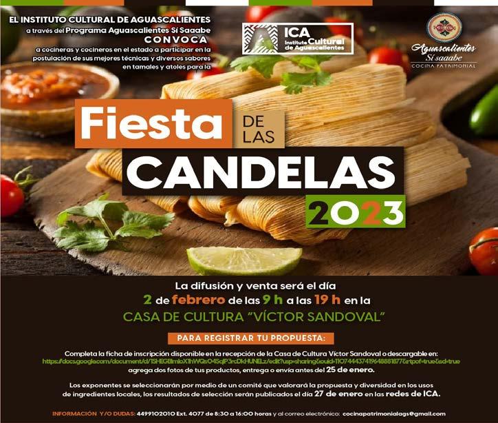 El Instituto Cultural de Aguascalientes (ICA) convoca a cocineras y cocineros del estado a postular sus mejores recetas de tamales y atole para participar en la “Fiesta de las Candelas 2023”, evento que se llevará a cabo en la Casa de la Cultura “Víctor Sandoval” el próximo 2 de febrero, y en el cual podrán vender y promocionar sus productos. Los interesados pueden llenar la ficha de inscripción en el enlace https://acortar. link/JH21vL o solicitarla en la recepción de la Casa de la Cultura con domicilio en