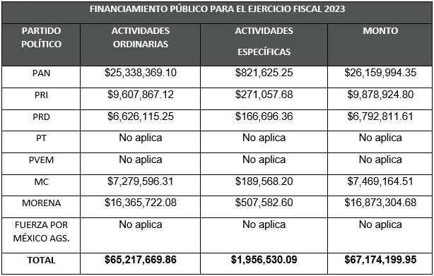 $ 67,174,199.95 del águila es lo que nos van a costar en el 2023 a los aguascalentenses mantener a cinco partidos que en realidad sólo son tres, ayer el Consejo General del Instituto Estatal Electoral de Aguascalientes avaló el financiamiento público estatal a los partidos políticos, desde ayer les surgieron nuevos amigos a Javier Luévano, Kendor Macías , Iván Sánchez Nájera , Gustavo Granados , y Gilberto Gutiérrez , sobre todo los van a comenzar a perseguir aquellos con quienes tienen deudas PAN, PRI, PRD, Movimiento Ciudadano, y Morena, porque para algunos proveedores los partidos nomás no finalizaron el proceso electoral y cargan todavía con algunas deudas por la campaña que llevó a Teresa Jiménez Esquivel; lo bueno es que los dirigentes estatales tienen un buen pretexto para sacarles la vuelta porque el monto viene “etiquetado” para actividades ordinarias y actividades específicas, así que lo que no fue presupuestado en este 2023… pues ya voló.