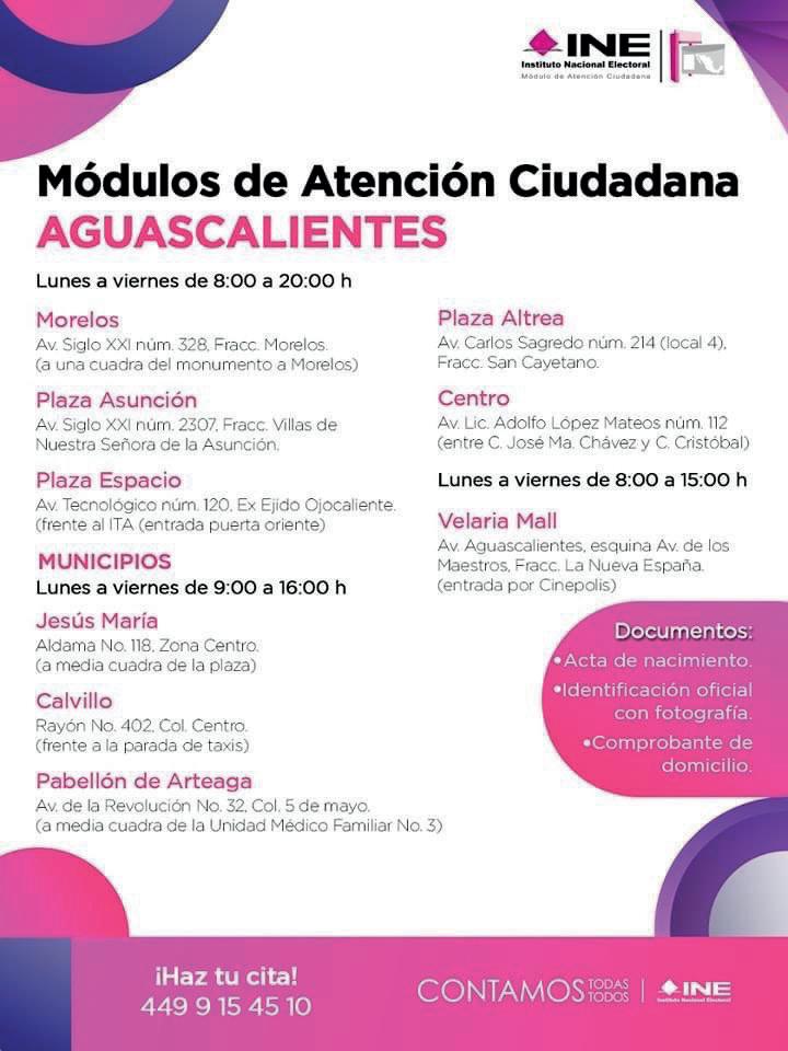 17:00 a las 20:00 horas en el fraccionamiento México, en el puente vehicular de Av. Aguascalientes, y el sábado 14 en la colonia Insurgentes, en la calle General Martín Espinoza Sánchez No. 212.