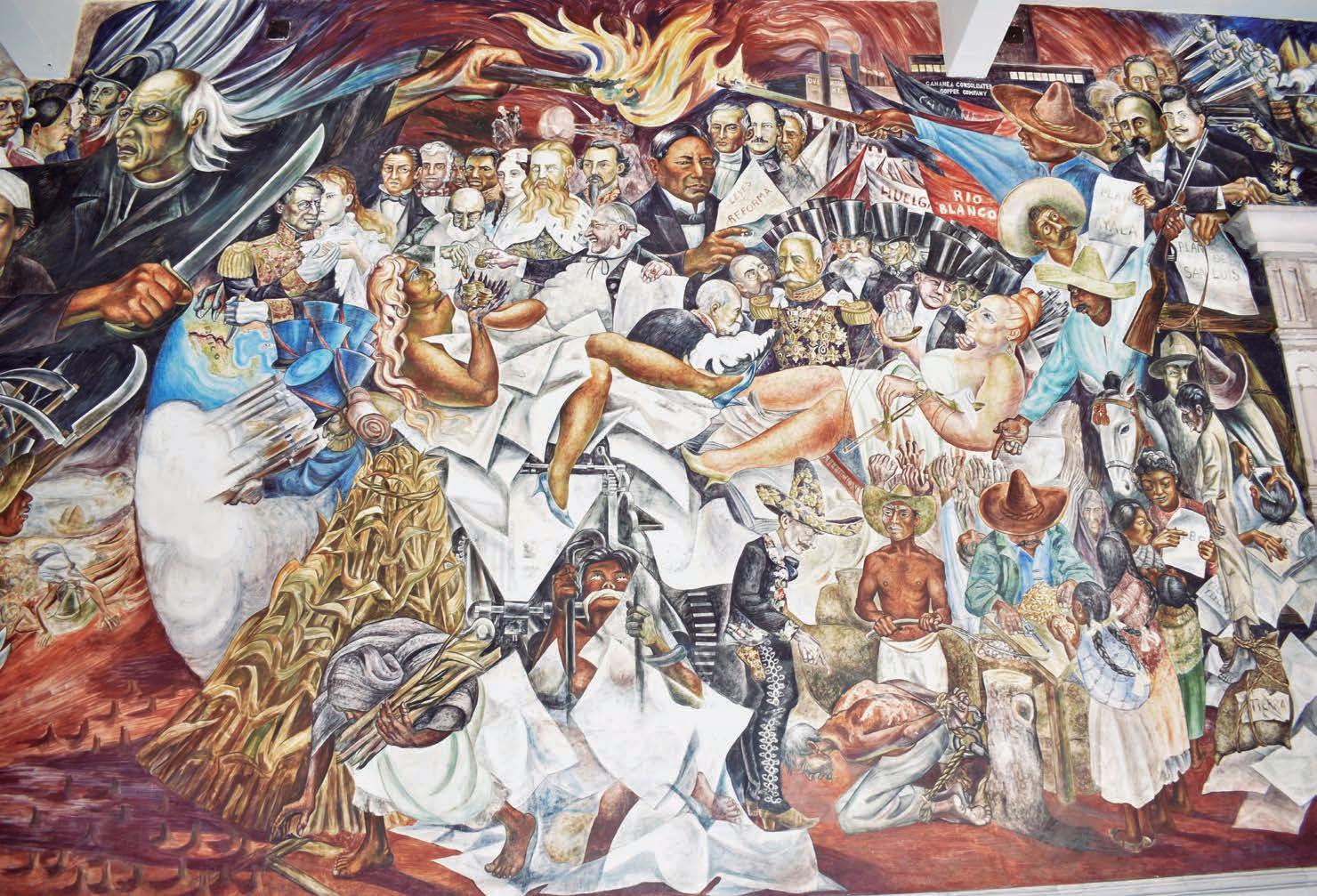 Como si se tratara de una línea del tiempo, de estos; de la Reforma, sigue el porfiriato, la paz injusta , simbolizado por ese cúmulo de ancianos, los científicos les llamaban, cuyas cabezas están coronadas con sombrero de copa, que rodean al general Porfirio Díaz, el personaje central de este periodo de la historia de