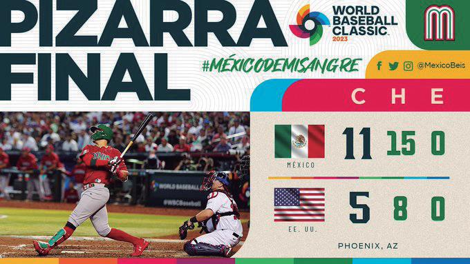 11 a 5 ganó la Selección Mexicana de Beisbol a Estados Unidos en el Clásico Mundial de Béisbol 2023, gran triunfo, en especial porque el equipo nacional inició este encuentro perdiendo ante Colombia. La novena tricolor descansa el lunes, vuelve a ocupar el diamante el martes para enfrentar a Gran Bretaña; al momento, México queda por encima de Estados Unidos debido al diferencial de carreras, ambos equipos con un juego ganado y otro perdido. Éxito para esta selección.