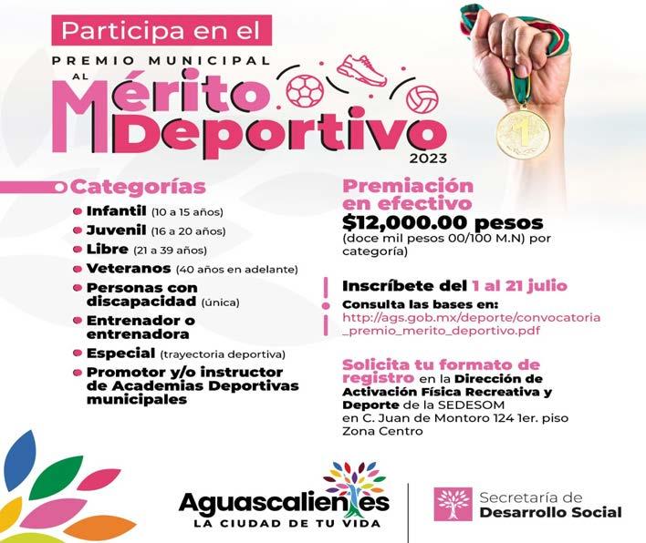 El Municipio de Aguascalientes a través de la Dirección de Activación Física, Recreación y Deporte de la Secretaría de Desarrollo Social, invita a medios de comunicación locales, agrupaciones deportivas y a la comunidad en general, a proponer a candidatos para participar en la Convocatoria al Premio Municipal al Mérito Deportivo 2023.