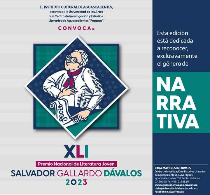 El Instituto Cultural de Aguascalientes convoca a participar en el XLI Premio Nacional de Literatura Joven Salvador Gallardo Dávalos 2023; esta edición está dedicada exclusivamente a Narrativa.