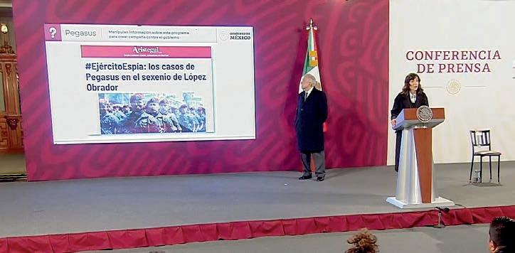 Dijo que a partir del domingo 2 de oc tubre, el medio Aristegui Noticias publicó una nota con el título “#EjércitoEspía, los casos de Pegasus en el sexenio de López Obrador”, en la que se informó que Citi zen Lab, dependiente de la Universidad de Toronto, Canadá, comprobó que se espiaba los teléfonos de dos periodistas y un activista en México.