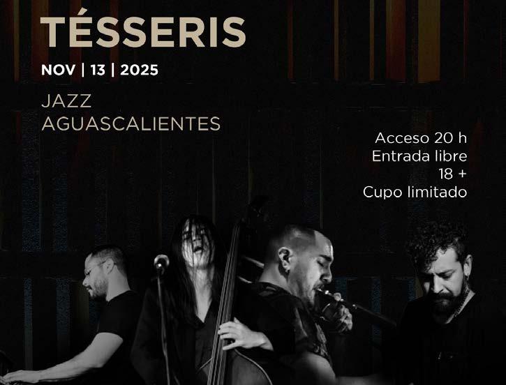 promete una noche vibrante en la que el piano, el contrabajo, la batería y los metales se entrelazarán para construir atmósferas tan íntimas como intensas. Tésseris se ha posicionado como una de las agrupaciones emergentes más sólidas de la escena jazzística mexicana. Su nombre, que remite a estructuras geométricas de cuatro dimensiones, también alude a su capacidad para expandir las fronteras del sonido y la improvisación. Cada integrante del ensamble aporta una energía única que se traduce en un lenguaje musical tan sofisticado como visceral.
