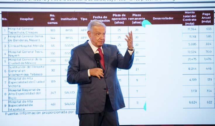 El presidente Andrés Manuel López Obrador reiteró que el Gobierno de México mantiene la propuesta de compra definitiva de nueve hospitales concesionados en las administraciones anteriores hasta por 25 años bajo el esquema de Asociación Pública, Privada y de Proyecto de Prestación de Servicios, lo que actualmente representa un gasto anual de 5 mil 651 millones de pesos.