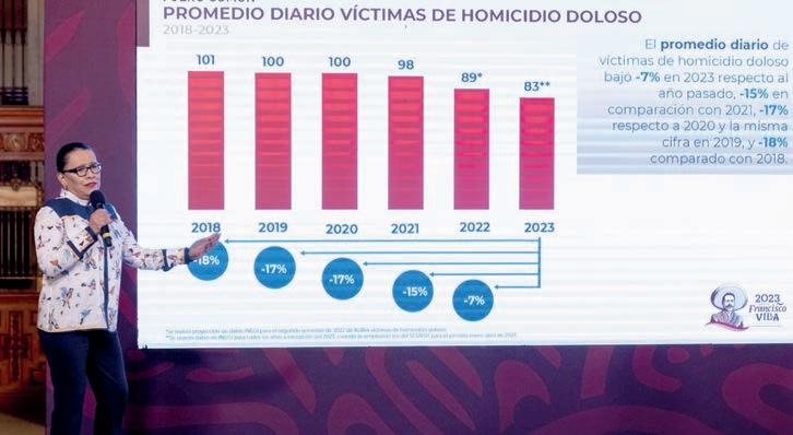 En conferencia de prensa matutina con el presidente Andrés Manuel López Obrador expuso que se registraron 16.1 por ciento menos víctimas de homicidios dolosos respecto al máximo histórico de 2018.
