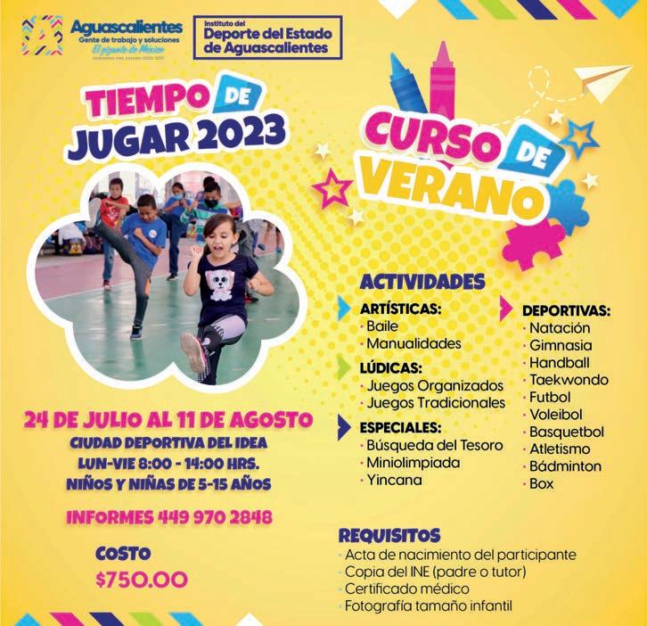 Con el objetivo de que las niñas, niños y jóvenes de Aguascalientes disfruten sus vacaciones, y en respuesta a la gran participación en los diferentes cursos de verano, el Instituto del Deporte del Estado de Aguascalientes (IDEA) puso en marcha un nuevo curso de verano “Tiempo de Jugar 2023”, que se llevará a cabo del 24 de julio al 11 de agosto en las instalaciones de la Ciudad Deportiva del IDEA. Este curso se realizará de lunes a viernes de 8:00 de la mañana a las 2:00 de la tarde y está dirigido a pequeños desde los cinco hasta los 15 años de edad. En este curso se impartirán dife -