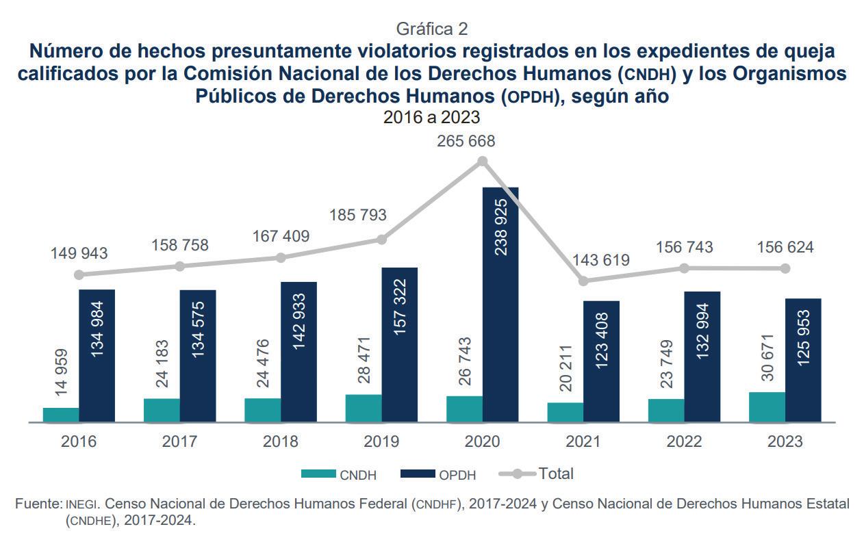 El Instituto Nacional de Estadística y Geografía (INEGI) da a conocer los resultados del Censo Nacional de Derechos Humanos Federal (CNDHF) y del Censo Nacional de Derechos Humanos Estatal (CNDHE) 2024. Estos programas estadísticos ofrecen información sobre la gestión y desempeño de la Comisión Nacional de los Derechos Humanos (CNDH) y de los Organismos Públicos de Derechos Humanos (OPDH) de cada entidad federativa, específicamente en las funciones de gobierno, capacitación, difusión, defensa y protección de los derechos humanos. Su finalidad es vincular los datos con el diseño, implementación, monitoreo y evaluación de las políticas públicas de alcance nacional en dichas funciones.