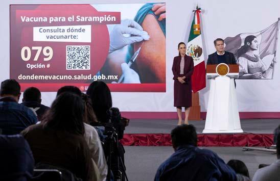 La jefa del Ejecutivo Federal puntualizó que en un año sólo hay 9 mil 400 casos de sarampión. Ante esto, reiteró el llamado a que se vacunen los grupos prioritarios: niñas y niños de entre 6 meses de edad y 12 años, que no ha recibido vacuna o cuya primera dosis fuera hace más de 6 meses; así como personas de 13 a 49 años no vacunadas o con esquema incompleto que viven en 11 entidades que concentran la mayor incidencia por 100 mil habitantes, los cuales son: Jalisco, Colima, Chiapas, Sinaloa, Durango, Ciudad de México, Nayarit, Tabasco, Sonora, Tlaxcala y Puebla. “Los centros de salud los pueden encontrar en dondemevacuno.salud.gob.mx o llamando al 079”, agregó.