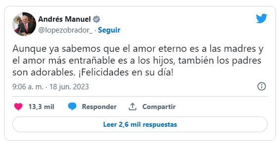 El presidente Andrés Manuel López Obrador publicó en sus redes un mensaje de felicitación con motivo del Día del Padre. “Aunque ya sabemos que el amor eterno es a las madres y el amor más entrañable es a los hijos, también los padres son adorables. ¡Felicidades en su día!”, expresó.