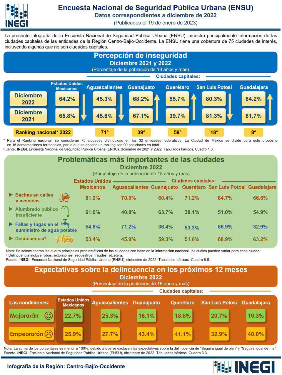 A pesar de nuestros vecinos y los hechos violentos que se han desarrollado en las fronteras de Aguascalientes, los primeros 100 días de la administración de Teresa Jiménez Esquivel no empiezan con malos números sobre la percepción de inseguridad, de acuerdo al INEGI, en diciembre del 2022, la apreciación ciudadana sobre este tema descendió, de 45.8 a 45.3, mientras que en las capitales de las entidades que nos rodean los números se disparan (Guanajuato, 68.2; Guadalajara, 84.2; mientras que Fresnillo, Zacatecas e Irapuato, ocupan los tres primeros puestos de este indicador en todo el país), los resultados del cuarto trimestre del año pasado de la Encuesta Nacional de Seguridad Pública Urbana no necesariamente reflejan las condiciones reales que se viven por el crimen organizado, miden la percepción, pero son un punto de partida para entender porqué la insistencia del gobierno de Tere Jiménez en el programa Blindaje Aguascalientes, e indicar por anticipado que cualquier medida que desde el gobierno se tome, no será suficiente, pues la expectativa sobre la delincuencia en los próximos 12 meses, al menos en Aguascalientes, es que empeorará el panorama, al menos así lo piensa 27.7% de los aguascalentenses.
