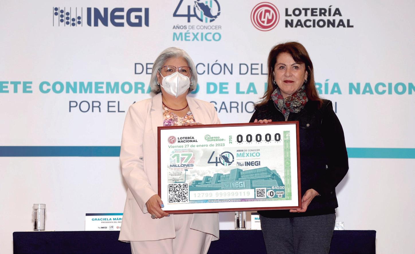 Con la dedicatoria del Sorteo Superior No. 2751 de la Lotería Nacional al Instituto Nacional de Estadística y Geografía, inician los festejos del 40 aniversario de esta institución. Desde su fundación, el 25 de enero de 1983, el INEGI ha generado información de calidad, pertinente, veraz y oportuna para coadyuvar el desarrollo nacional.