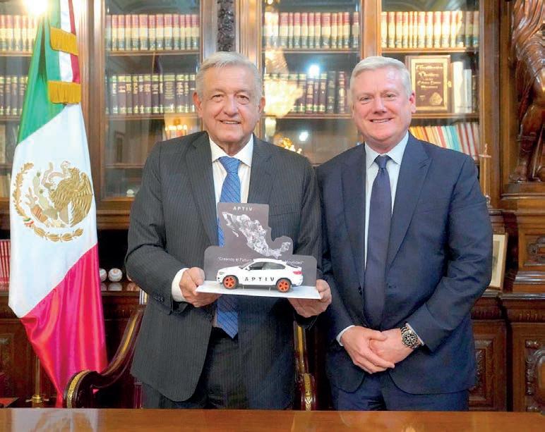 El presidente Andrés Manuel López Obrador recibió en Palacio Nacional a Kevin P. Clark, CEO de Aptiv, empresa desarrolladora de tecnología para movilidad sustentable, autónoma y eléctrica. A través de sus redes sociales, el mandatario destacó que esta compañía seguirá invirtiendo en el país. A la fecha, sus plantas emplean a 78 mil 700 trabajadoras y trabajadores mexicanos. Por parte del Gobierno de México asistieron la secretaria de Economía, Raquel Buenrostro Sánchez y el secretario de Hacienda y Crédito Público, Rogelio Ramírez de la O. La comitiva empresarial de Aptiv estuvo integrada por el presidente en Latinoamérica y de Sistemas de Distribución Eléctrica, Arturo Álvarez; el vicepresidente Senior de Finanzas y Relaciones Gubernamentales, Tim Seitz y la directora de Relaciones Gubernamentales, Lorena López.
