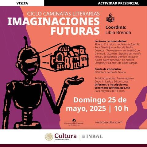 La Secretaría de Cultura del Gobierno de México y el Instituto Nacional de Bellas Artes y Literatura (INBAL), a través de la Coordinación Nacional de Literatura, llevarán a cabo una caminata literaria por calles del Centro Histórico de la Ciudad de México. La actividad se realizará el domingo 25 de mayo a las 10 horas, y el punto de encuentro será la Biblioteca Lerdo de Tejada, ubicada en la calle República de El Salvador 49, Centro Histórico, Ciudad de México.