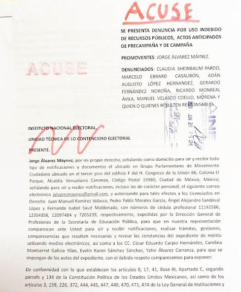Lo que están haciendo las corcholatas de Morena “se llama PRECAMPAÑA. Y es ILEGAL” escribió en Twitter Jorge Álvarez Máynez , así informó el coordinador de los diputados de Movimiento Ciudadano que presentaron una nueva denuncia contra los aspirantes presidenciales de Morena, el Verde y PT por uso indebido de recursos públicos y actos anticipados de campaña, se acusó a Claudia Sheinbaum , Marcelo Ebrard , Adán Augusto Lopez , Ricardo Monreal, Gerardo Fernández Noroña y Manuel Velasco de violentar la legislación electoral con actos proselitistas en Nuevo León, Oaxaca, Ciudad de México y el Estado de México, y por la hora en que se recibió la denuncia en el INE no alcanzaron a incluir a Aguascalientes, donde el ex titular de Gobernación se paseó barato por Rincón de Romos y la Morelos acá en la capital.