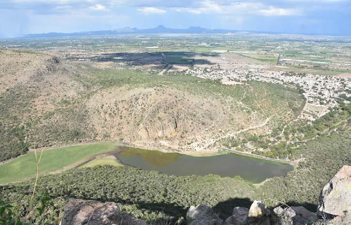 pie se encuentra, al oriente de la Presa de San Blas, que se observa en primer plano. La cámara fue dirigida hacia el noreste. Por esta razón de Pabellón de Hidalgo aparece la mitad, con la plaza y la parroquia a la derecha, casi en el borde de la gráfica. Mi intención al tomar la foto así fue ubicar en el centro, al fondo, la Sierra de Tepezalá, con el cerro de Altamira hacia el centro, y el de San Juan al lado derecho, y si en el Ombligo de la Luna tienen su Idilio de los volcanes, nosotros tenemos nuestra propia versión; faltaba más, porque mientras no ocurra un cataclismo, estas montañas seguirán acompañándose durante millones de años.