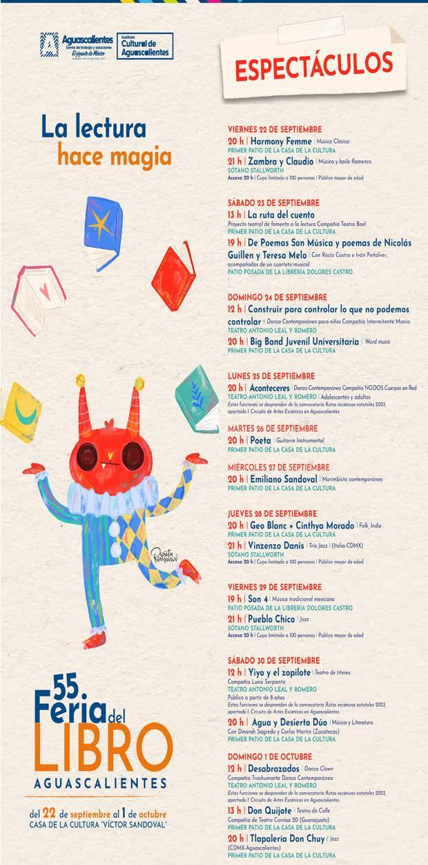 sar al centro histórico teniendo como sede principal la Casa de la Cultura, pero además este festival se extiende a varios centros culturales del ICA”. Vázquez Zúñiga precisó que las sedes alternas en las que también se realizarán diversas actividades son el Centro de Artes Visuales, Casa Terán, Biblioteca “Enrique Fernández Ledesma”, Biblioteca “Jaime Torres Bodet”, Museo de Arte Contemporáneo No. 8, Sótano Stallworth, Patio Posada y el Teatro Morelos. Esta edición lleva por lema “La lectura hace magia” y las ilustraciones de la imagen fueron realizadas por Rosita Romanov, artista hidrocálida. El programa general puede consultarse en las redes sociales del Instituto Cultural de Aguascalientes https://www.facebook.com/InstitutoCulturaldeAguascalientes y en la página de la Feria del Libro de Aguascalientes https://www. facebook.com/FeriadellibroAgs.