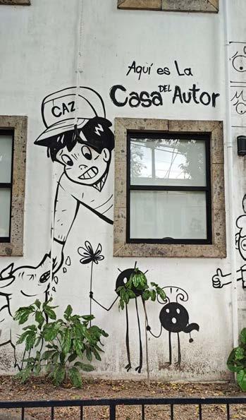 Finalmente, la Casa del Autor Zapopan también ha sido apropiada visualmente por sus residentes. Artistas locales, nacionales e internacionales han intervenido el espacio con murales y piezas gráficas, dejando una huella permanente de su paso por el programa y dotando al recinto de identidad, color y memoria colectiva.