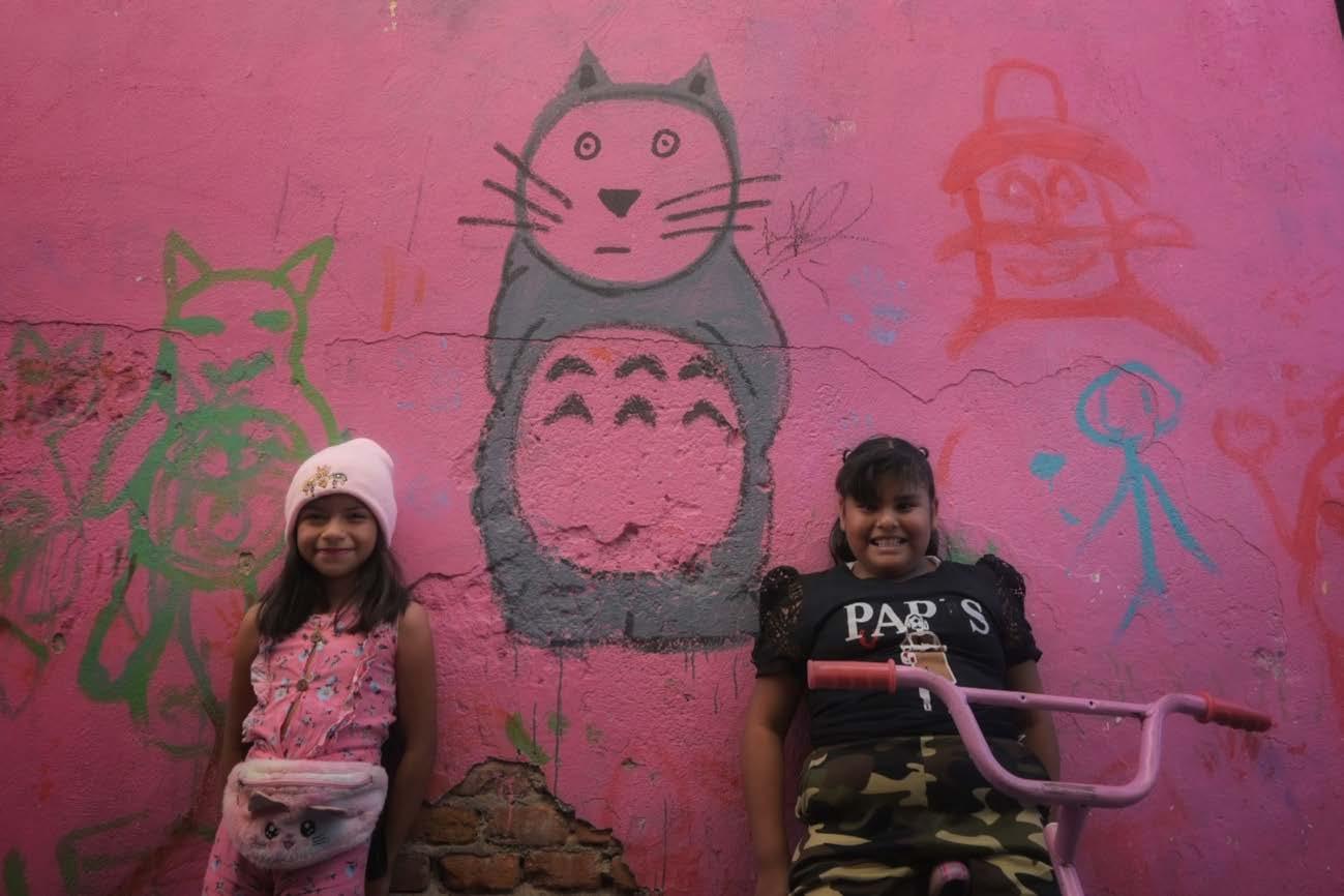 Las fotografías que presento aquí provienen de distintos procesos: algunos profundamente personales, otros guiados por la curiosidad. Aparecen objetos cotidianos de la cultura mexicana, encuentros con personajes de una ciudad viva y palpitante, y personas que me comparten fragmentos de sus historias. Como en la imagen Infancia y territorio, donde las niñas me hablan de su mural y, después, me piden la cámara para retratarme ellas mismas.