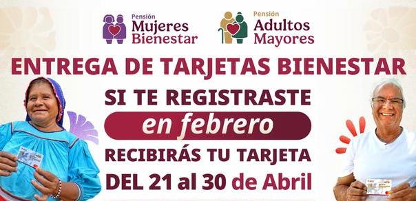 Del 21 al 30 de abril, entrega de tarjetas a derechohabientes de Pensiones para Adultos Mayores y Mujeres Bienestar