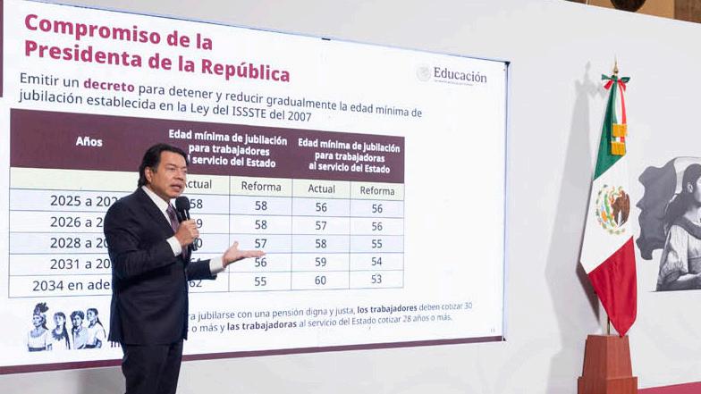 En la conferencia, el secretario de Educación Pública (SEP), Mario Delgado, explicó que el decreto relacionado con la edad de jubilación de trabajadores del Estado marca la reducción paulatina para llegar, en el año 2034 a los 53 para mujeres y 55 para hombres.