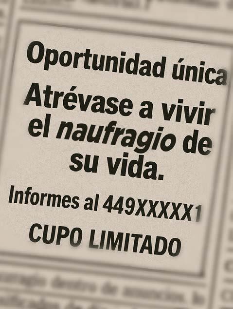 Lo tuve que leer dos veces, como menos, para asegurarme de que, en efecto, había leído correctamente lo que ahí se anunciaba. Al tratarse de una ciudad ubicada a más de 800 km de la costa más cercana, la palabra “naufragio” dentro de los anuncios clasificados del diario local resaltaba, no solo por el formato en negrita sino por la palabra misma, puesto que no pertenecía ahí, y hacía pensar a cualquiera que pasara su vista sobre ella que se trataba de un error. Sin embargo, no lo era en absoluto: a cuatro líneas el anuncio desplegaba la invitación claramente: