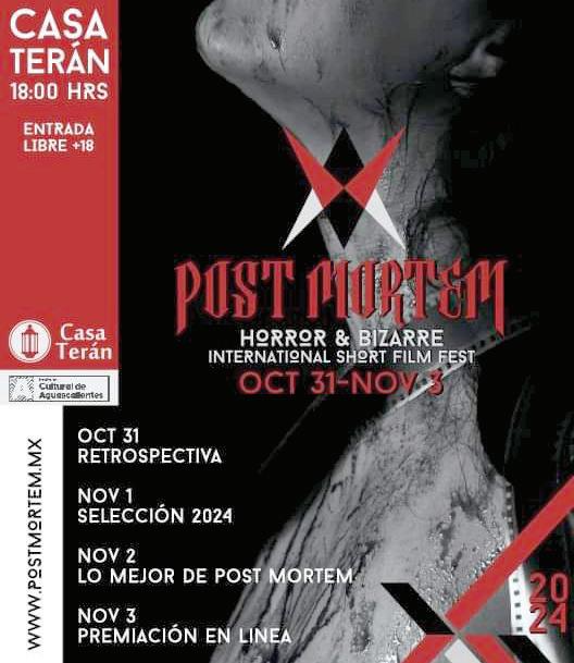 Postmortem es un festival internacional de cortometrajes de horror que inició en 2009. Tras una pausa, este año regresa con energías renovadas. Eddy Yovoniel destacó que Aguascalientes es un lugar ideal para este tipo de eventos y afirmó: “Tenemos el Cerro del Muerto, la Catrina, el Museo de la Muerte, y estamos en el centro del país. Aguascalientes es un punto clave para el cine de terror”.