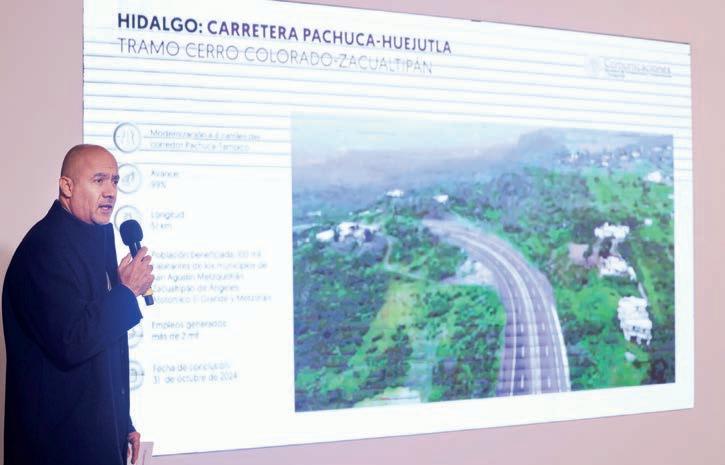 El secretario de Infraestructura, Comunicaciones y Transportes, Jesús Antonio Esteva Medina, informó avances en las 10 obras de infraestructura más importantes que realiza el Gobierno de México y que unas serán concluidas a finales de este año y en los primeros meses de 2025. “Todas estas obras, si bien son distancias que pueden no ser tan extensas, son complejas en cuanto a toda la infraestructura que se debe construir”. Informó que, en Hidalgo, el tramo Cerro Colorado-Zacualtipán, de la carretera Huejutla-Pachuca, registra 99 por ciento de avance y estará concluida el 31 de octubre, mientras que el tramo Real del Monte-Entronque Huasca de la misma carretera, presenta 87 por ciento de avance y estará terminado el 20 de enero de 2025.