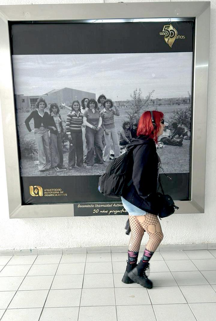 Por su parte esta imagen, la mía, no puede ser más elocuente: son el pasado y el futuro; lo que 50 años después probablemente se ha marchitado y lo que hoy está en proceso de florecimiento; la tradición y la modernidad, una modernidad acompañada por un ejercicio de la libertad que probablemente aquellas no conocieron. 50 años de la UAA, pero entre estas estudiantes existe una distancia insalvable, tanto temporal como cultural. Tanto así se han transformado Aguascalientes y su universidad; tanta luz que ha irradiado de sus aulas. 50 años, y lo que falta…
