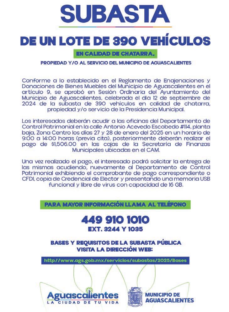 Los detalles de la convocatoria pueden consultarse en https://bit.ly/ApoyosPecuarios; o bien, comunicarse al teléfono 449 910 26 07 o acudir a las oficinas de la SEDRAE en av. Adolfo López Mateos No. 1509 oriente, fraccionamiento Bona Gens, de las 8:30 a 15:00 horas.
