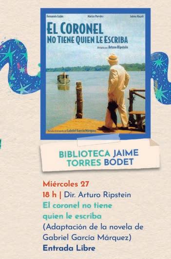 la deriva” de Horacio Quiroga), director Luis Paulo de la Fuente; y El coronel no tiene quien le escriba (adaptación de la novela de Gabriel García Márquez), director Arturo Ripstein. Para finalizar con las actividades del día, en el primer patio de la Casa de la Cultura Víctor Sandoval se contará con la participación de Emiliano Sandoval, marimbista contemporáneo, a las 20:00 horas.